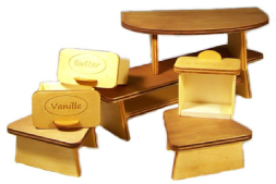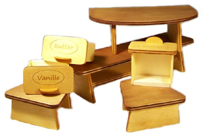 Auf dem Bild Reinhard 3 : Pappel 2-farbig gebeizt (hell/dunkel) + farbige Lasuren für Tischplatten und Frontwände/Schaufenster, geschliffen und geölt. (399,00)