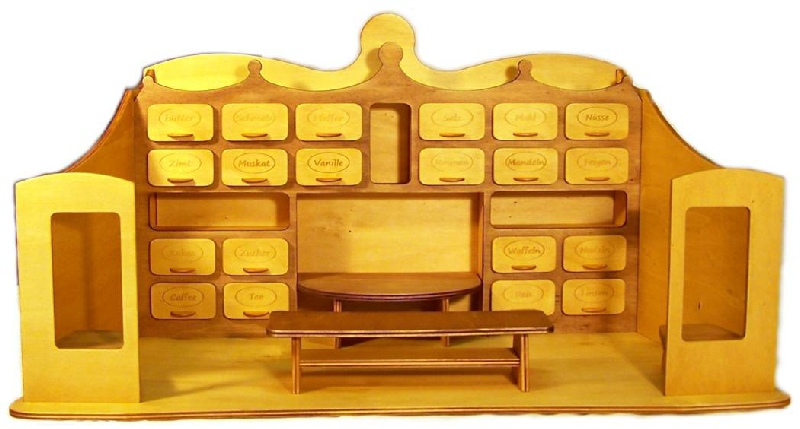 Sehr Aufwendig gearbeiteter Kaufmannsladen mit 20 beschrifteten Schubkästen, 3 offenen Ablagen in der Rückwand, Rückwandtisch, Fronttisch und 2 Schau-fenstertischen.