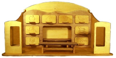 Aufwendig gearbeiteter Kaufmannsladen mit 8 bebilderten Schubkästen, Rückwandtisch, Fronttisch und 2 Schaufenstertischen.