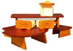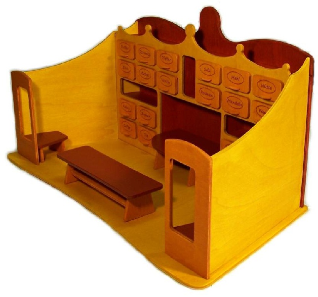 Auf dem Bild Reinhard 3 : Pappel 2-farbig gebeizt (hell/dunkel) + farbige Lasuren für Tischplatten und Frontwände/Schaufenster, geschliffen und geölt. (399,00)