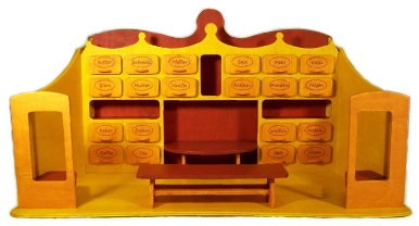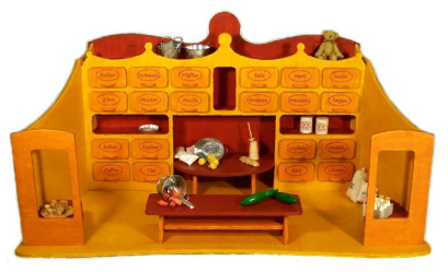 Sehr Aufwendig gearbeiteter Kaufmannsladen mit 20 beschrifteten Schubkästen, 3 offenen Ablagen in der Rückwand, Rückwandtisch, Fronttisch und 2 Schau-fenstertischen.