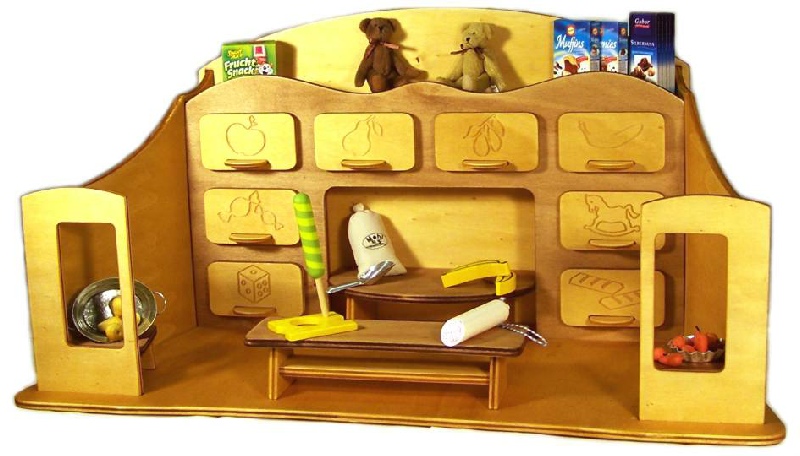 Die Kaufmannsläden werden aus Pappel- oder Birkenholz gefertigt, die Oberflächen werden mehrfach geschliffen und können mit für Spielzeug geeigneten Naturstoffen oder Lasuren behandelt werden. Abschließend  kann eine Leinölbehandlung erfolgen um eine angenehm glatte Oberfläche zu erzeugen.